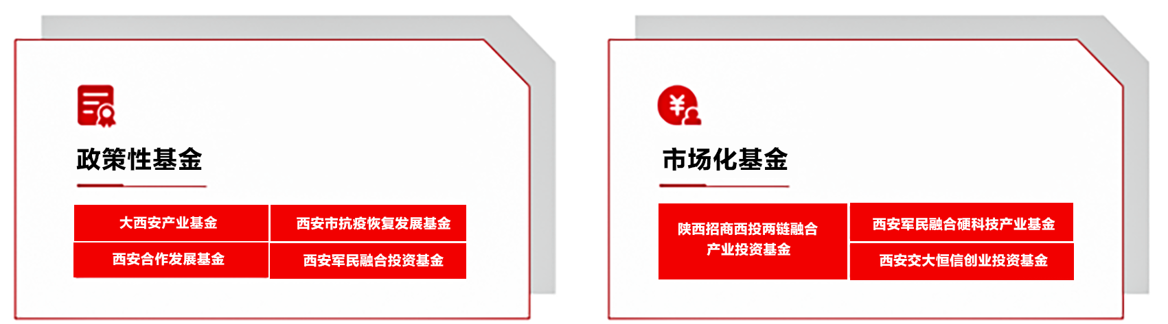 已發(fā)起設(shè)立大西安產(chǎn)業(yè)基金,全國(guó)首支兼顧“抗疫紓困”和“產(chǎn)業(yè)發(fā)展”的西安市抗疫恢復(fù)發(fā)展基金、西安合作發(fā)展基金、軍民融合基金等,參與設(shè)立陜西西安國(guó)資國(guó)企綜合改革試驗(yàn)基金,西安市工業(yè)(支柱產(chǎn)業(yè))倍增基金等,設(shè)立招商西投兩鏈融合基金。