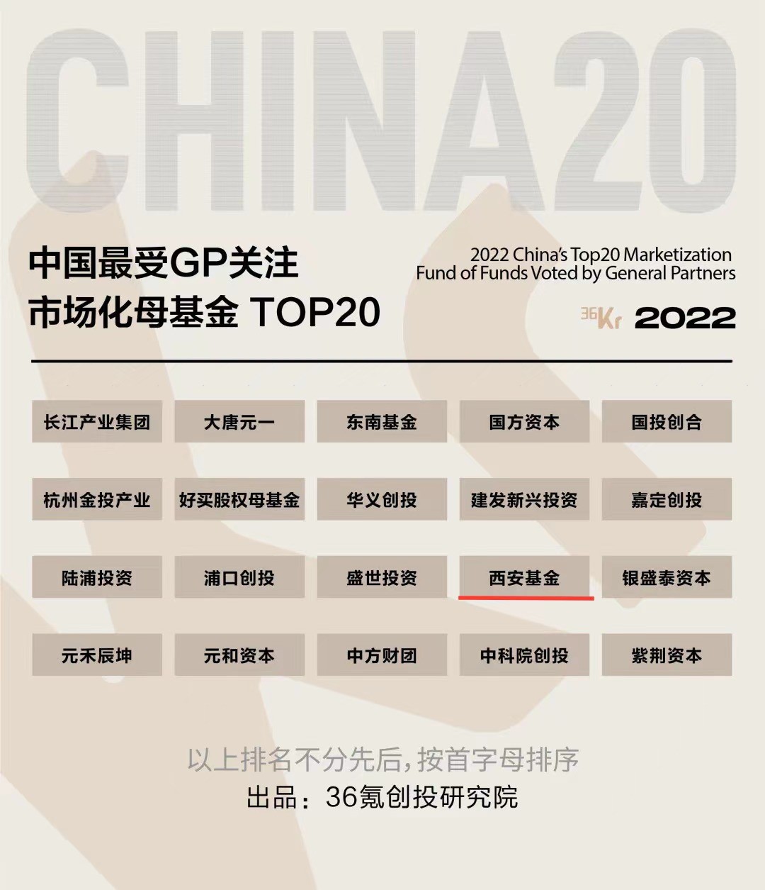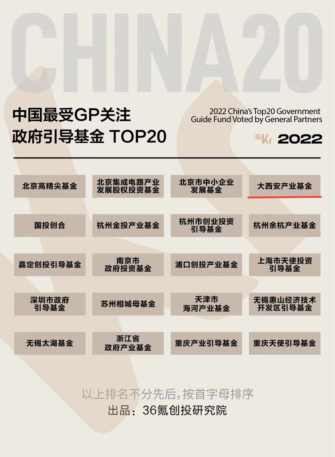 2022年9月21日,在36氪“2022 置身事內(nèi)·中國基金合伙人峰會”上,36氪創(chuàng)投研究院公布了2022年度「本土市場」、「白馬/黑馬」以及「最受GP關(guān)注LP」三大系列年度榜單。在「最受GP關(guān)注LP」系列榜單中,大西安產(chǎn)業(yè)基金榮獲“中國最受GP關(guān)注政府引導(dǎo)基金TOP20”,西安產(chǎn)業(yè)投資基金管理有限公司榮獲“中國最受GP關(guān)注市場化母基金TOP20”。